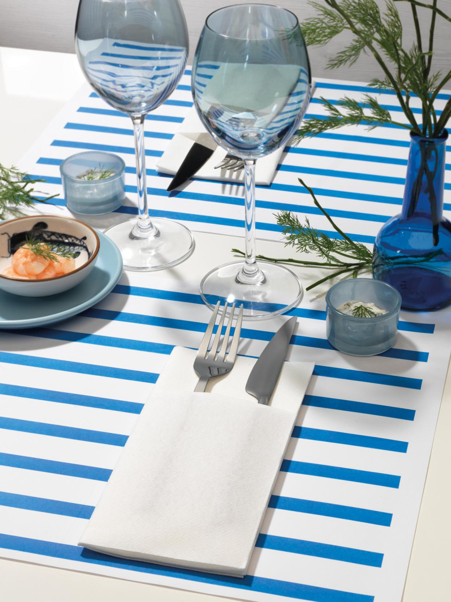 Pratique, le pliage de cette serviette permet d'y glisser les couverts en formant une pochette élégante. Elle est idéale pour le dressage des terrasses car les serviettes ne s'envolent plus et les couverts sont en partie protégés.
