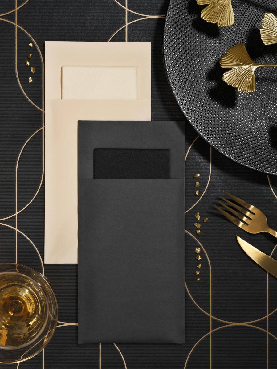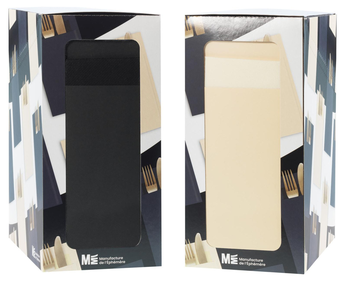 Cette nouvelle gamme de pochettes à couverts en papier appelée Les Elégantes propose un produit haut de gamme avec son format généreux et ses deux coloris sophistiqués : Carbone et Champagne.